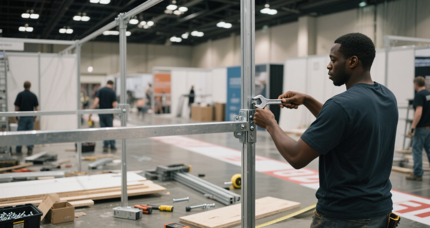 Installers assemble the booth exactly to spec — aligning, lighting, and stabilizing every element to create a polished display.